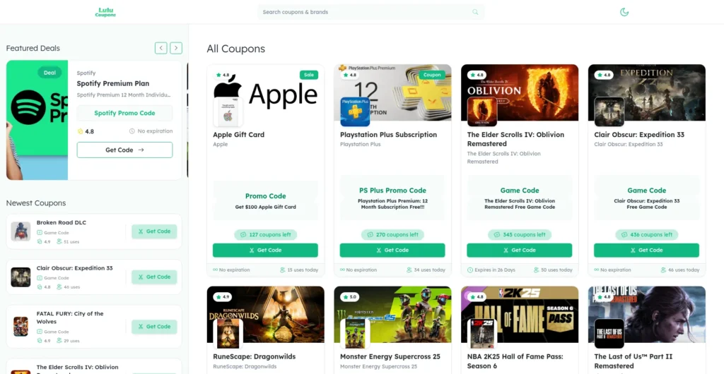 LuluCoupons.com is a platform that offers free coupon codes, gift cards, and exclusive deals for popular services like Netflix, Spotify, PlayStation, and more, updated daily to help users save money.